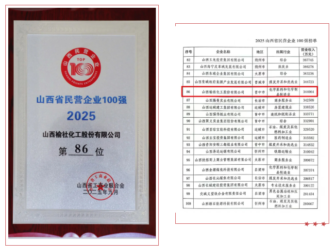 9月18日,在“百强民企聚龙城、凝心聚力促转型”2025晋商主题沙龙活动现场,省工商联重磅发布“2025山西省民营企业100强”“2025山西省民营企业制造业30强”“2025山西省民营企业服务业20强”系列榜单。公司再次荣登省民营企业100强榜单,排名第86位。